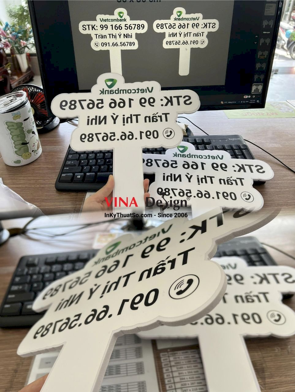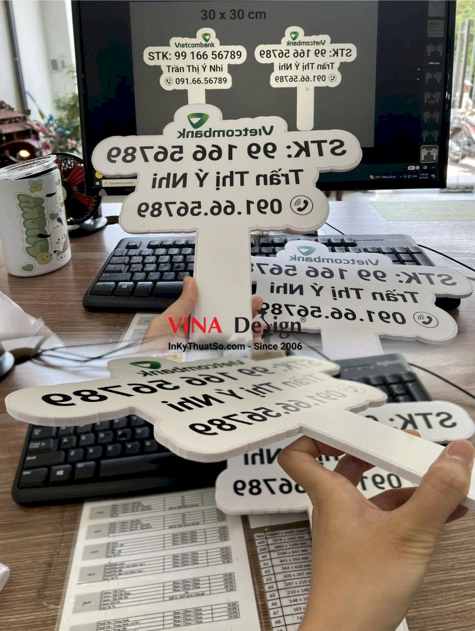 Sản phẩm in hashtag cầm tay số tài khoản ngân hàng shop bán hàng online livestream, quy cách in: