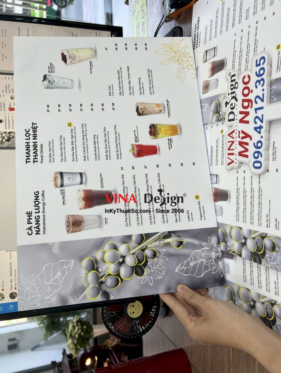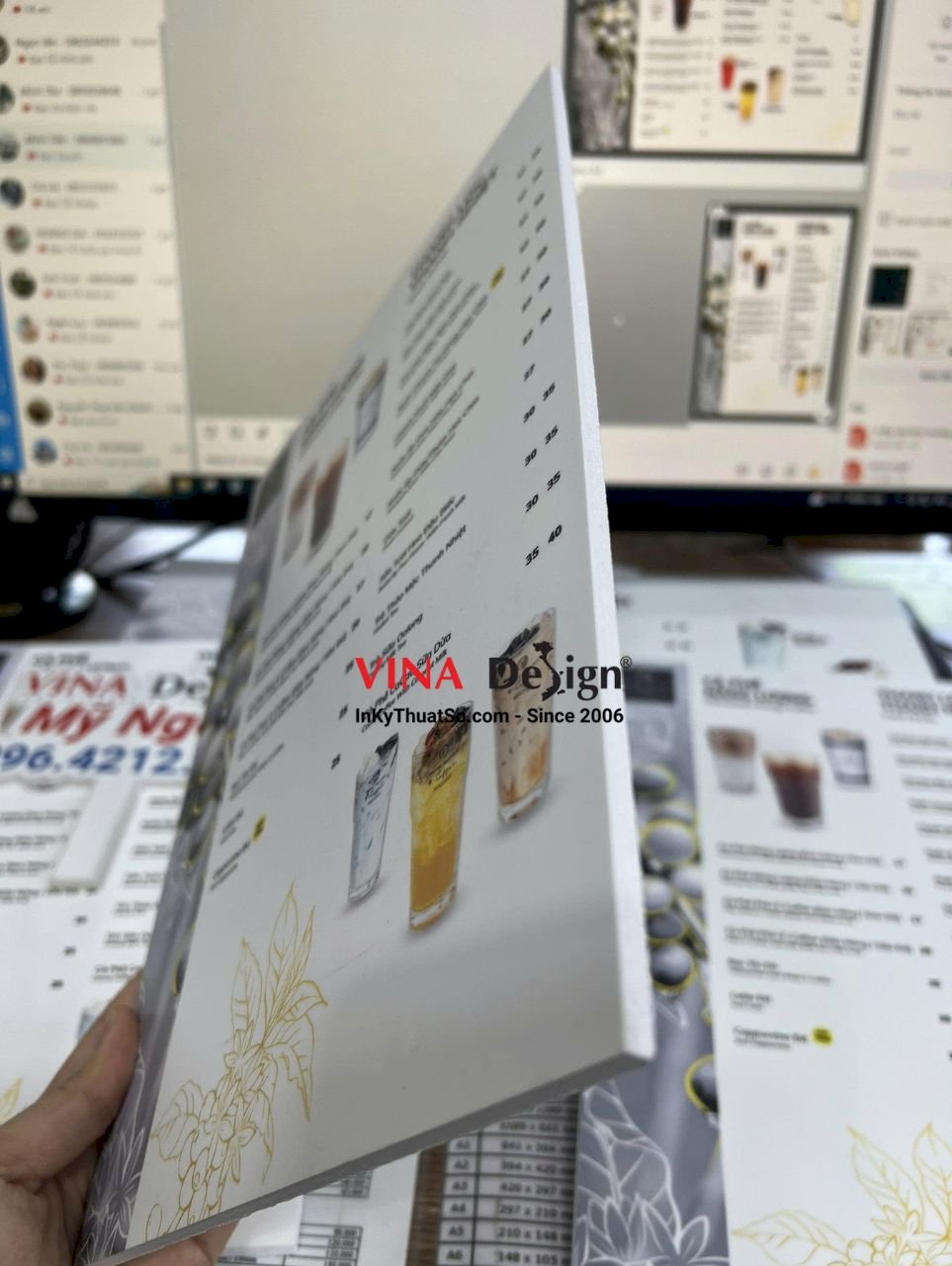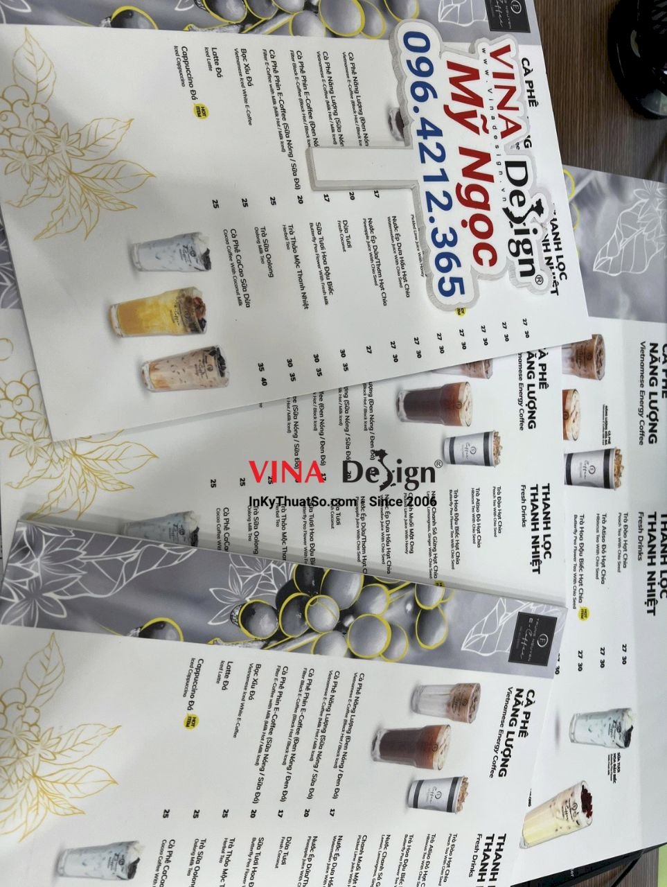 VINADESIGN - Thiết kế & in menu nhà hàng, quán ăn, quán cà phê, shop, cửa hàng, Beauty Salon, Spa... theo yêu cầu - Chuyên in menu Formex TPHCM - In menu khổ A3, A4, đa dạng kích thước - In PP dán Formex 3ly, 5ly, 10ly cứng cáp, in đẹp sắc nét, không thấm nước, dùng bền - Xưởng in ấn gia công trực tiếp, giá in rẻ cạnh tranh, giao hàng toàn quốc từ TPHCM.