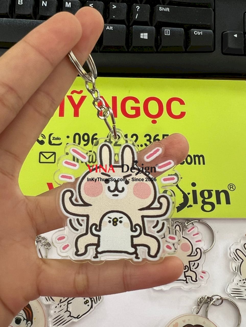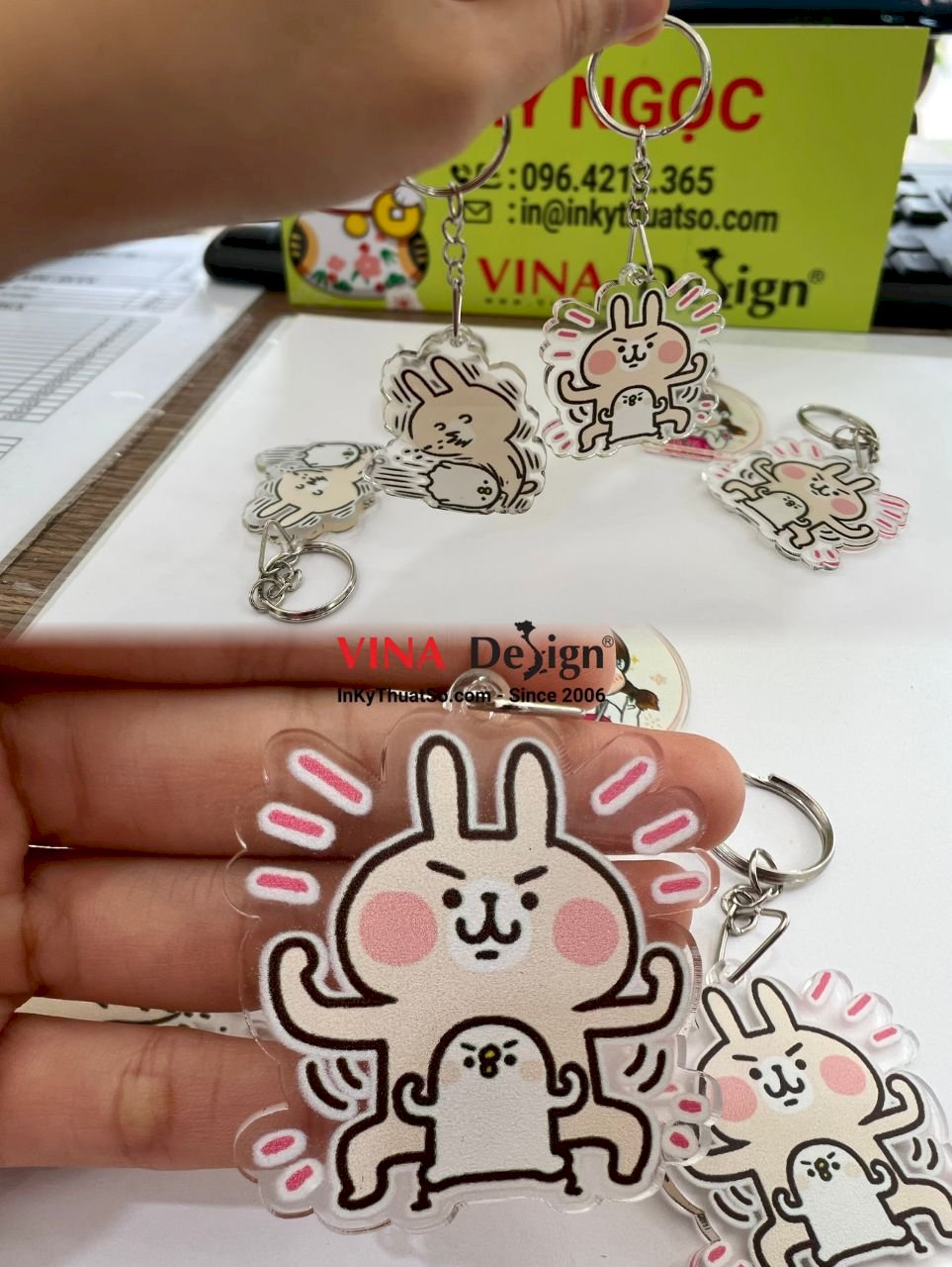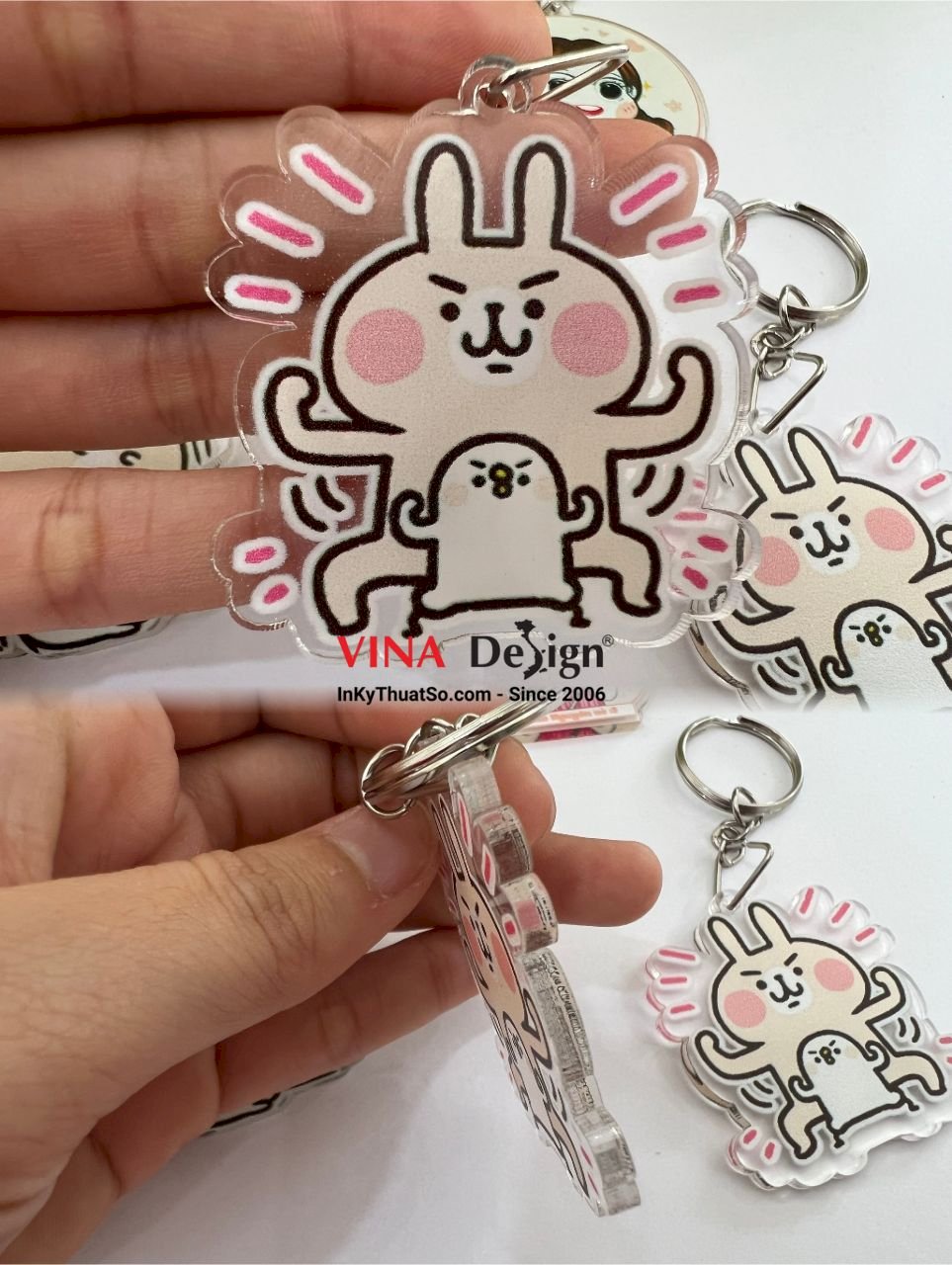 Sản phẩm in móc khóa mica thỏ Usagi gà Piske thỏ Kanahei, quy cách in: