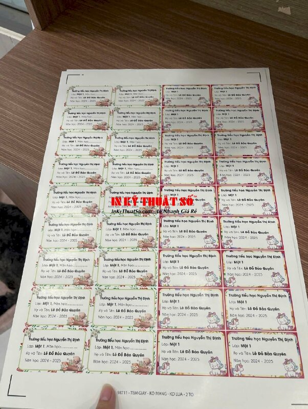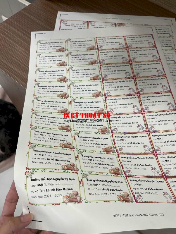 Trinh In Kỹ Thuật Số, In nhãn vở học sinh chất liệu decal giấy kích thước 4.5x7.5cm, in laser không màng có bế từng tem - In Kỹ Thuật Số Since 2006