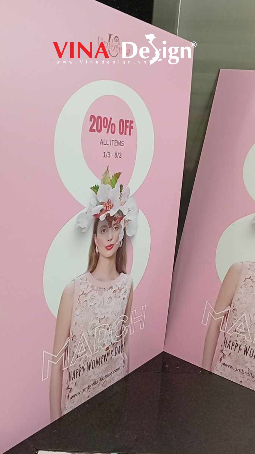 Sản phẩm in poster khuyến mãi Happy Women's Day 8-3, poster format để kệ standee khung gỗ chữ A, quy cách in: