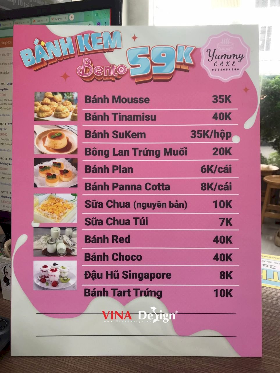 Sản phẩm in menu tấm cầm tay cho tiệm bánh kem, quy cách in: