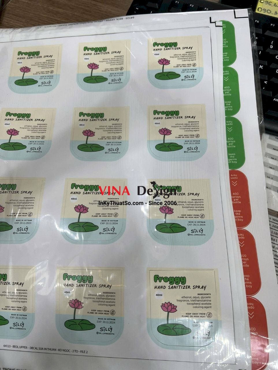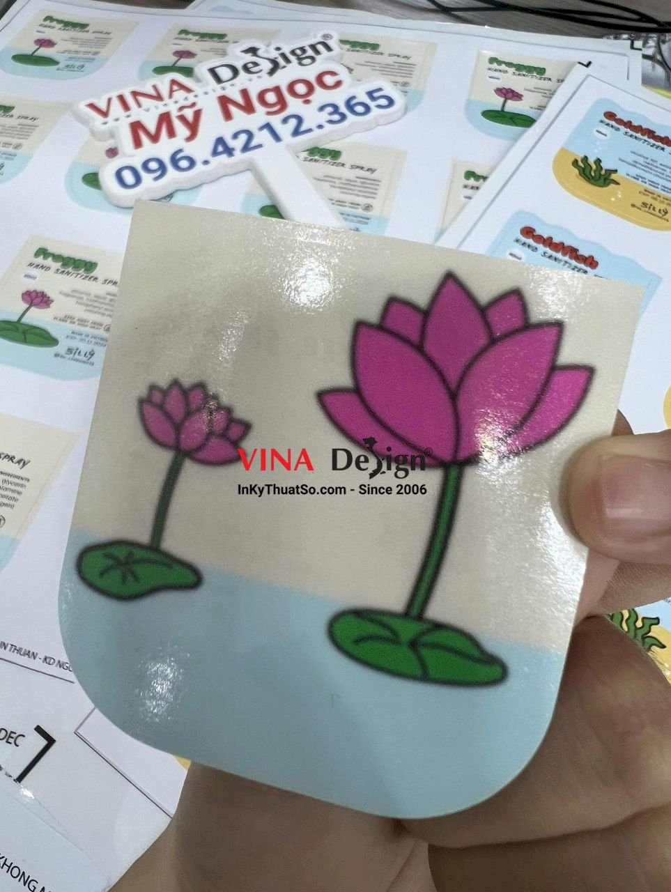Sản phẩm in tem 2 mặt dán chai sản phẩm nước xịt rửa tay, quy cách in: